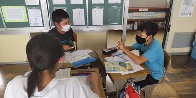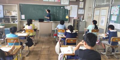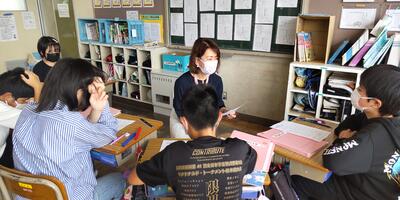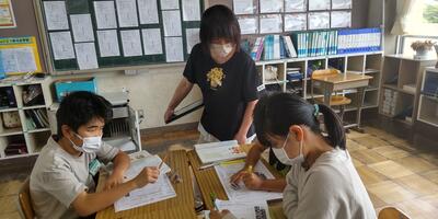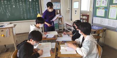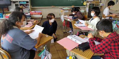 6年生は、「国語」の授業です。上高小をよりよくするためにできることは何か、グループごとに話し合っています。議論が白熱しています。