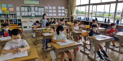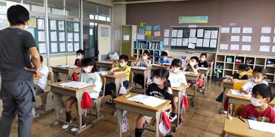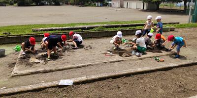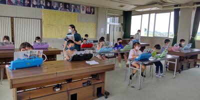 1年生は、「図工」の授業です。砂場で。大きな山をつくったり、トンネルをつくったりしていくのですね。2つのグループに分かれてどのようにつなげていくか、話し合っています。2年生は、「音楽」の授業です。「かえるのうた」を輪唱しています。
