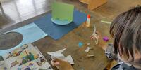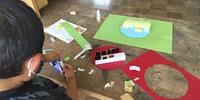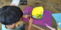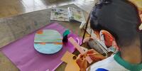3年生は、「図工」の授業です。円形の紙を重ねてわりピンでとめて回すと、様々な「ランド」が現れます。