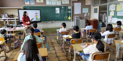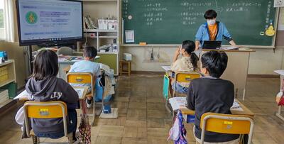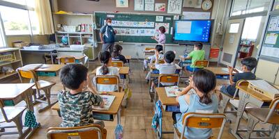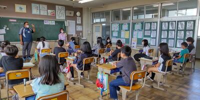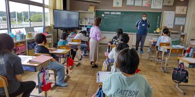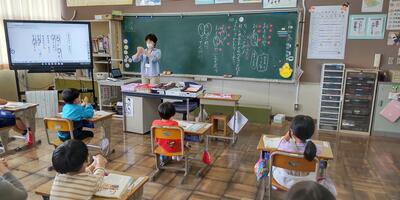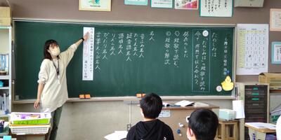 1年生は「国語」の授業です。「おもちや」と「おもちゃ」のことばの違い、分かったかな。2年生は、「国語」の授業です。「メモ」をとるときに、気を付けるのはどんなことかな。
