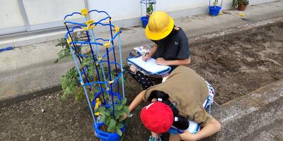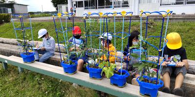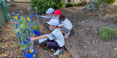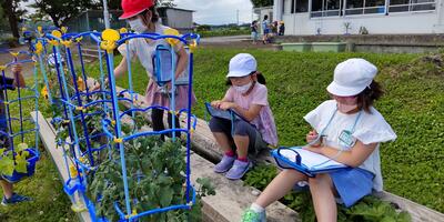 1年生は「音楽」の授業です。この後、「しろくまのジェンカ」を皆で踊るのですね。2年生は「生活」の授業です。観察をしています。すでに実を付けた野菜もありますね。