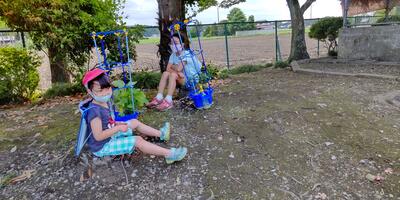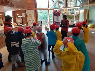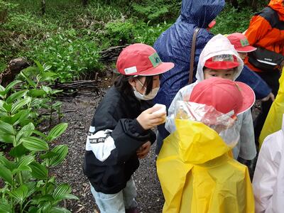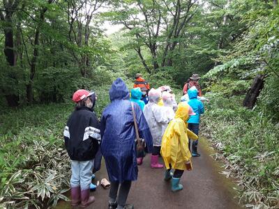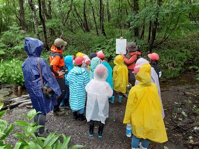 あいにくの雨ですが森で活動しています。川の始まりや森のダムの役割について話をしていただき、みんな興味津々、目を輝かせています。ジブリの世界を満喫しています。
