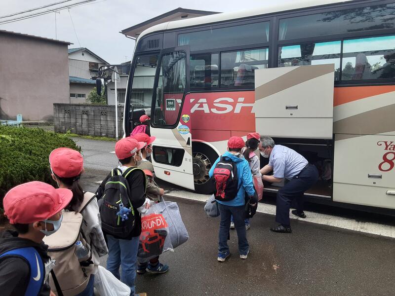 おはようございます。出発式を終えいよいよ宿泊学習のスタートです。15名全員元気です。3、4年生のパワーで空も少し明るくなってきました。2日間楽しく活動してきます。