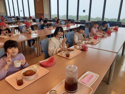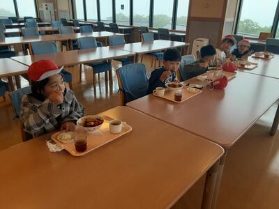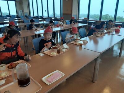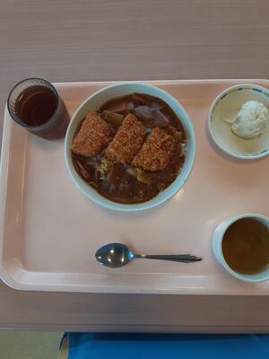 お待ちかねの昼食です。カツカレー、ポテトサラダ、スープが本日のメニューです。帽子をとるのも忘れもりもり食べている子もいます。ご覧のとおり、みんな元気です。