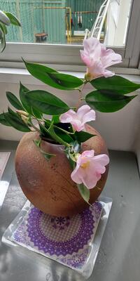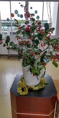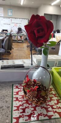 「クリスマスホーリー」(西洋ヒイラギともいわれますが日本のヒイラギとは種類が違うようです。)と「数寄屋侘助」という名前のピンク色の椿の花です。深紅色のバラは、「ル・ルージュ・エ・ル・ノワール」という名前だそうです。