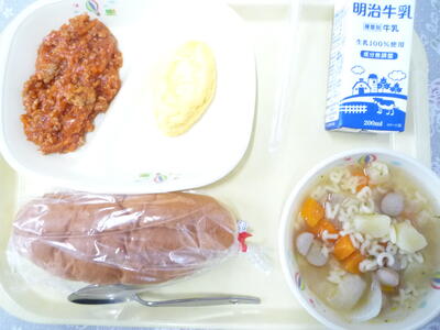本日のメニューは、「牛乳パン」、「牛乳」、「オムレツ」、「スラッピージョー」、「ABCマカロニスープ」です。スラッピージョー(写真でプレート左側)は、本場アメリカでは、人気のファストフードだそうです。「スラッピー」は、「だらしない」という意味があって、丸パンに具をはさむとこぼれやすくその様子が「だらしない」=「スラッピー」となったそうです。(諸説あり)今日の給食では、丸パンではなくコッペパンに切れ目を入れた状態(写真ではわかりにくいですが)だったので子ども達もそんなにはだらしない状況にならなくて済んだと思います。確かに丸パンだとたいへんだったでしょうね。今日も美味しくいただきました。ごちそうさまでした。