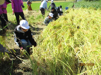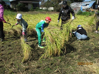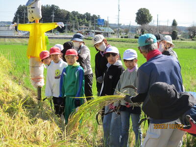 5年生が稲刈りを行いました。赤羽さんの指導のもと、手際よく作業を進めることができました。協力していただいた保護者の皆様、お忙しい中ありがとうございました。今年度も保護者の方を対象に、「ゆうだい21」の販売を予定しています。詳しくは、後日お知らせします。見守ってくれた、かかしの「ゆうだいくん」、お疲れ様でした!