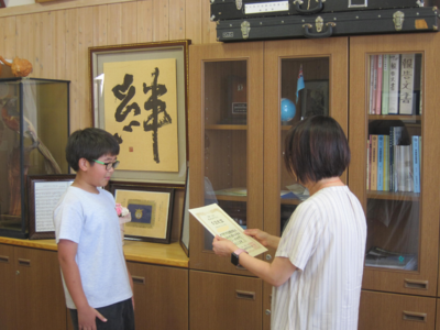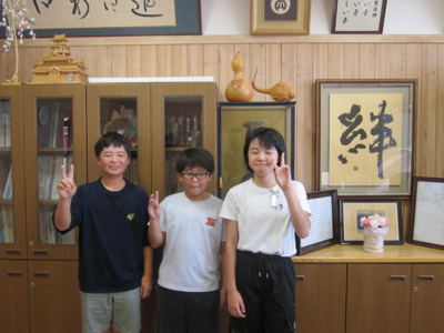 5月に実施した新体力テストでS級に認定された6年生3名に認定証を授与しました。