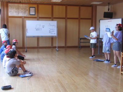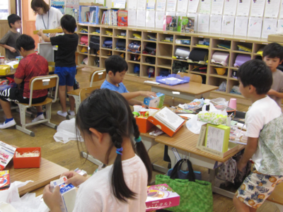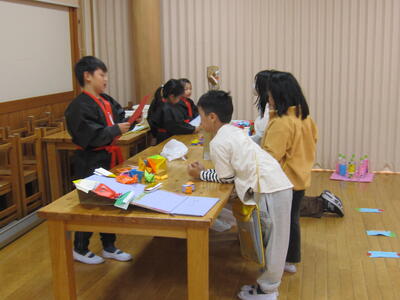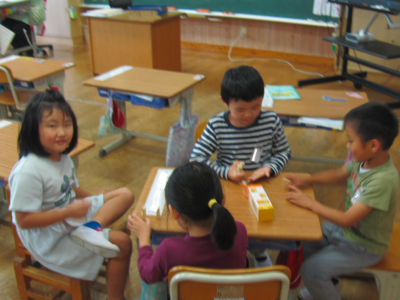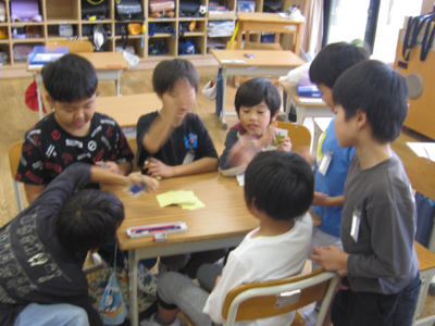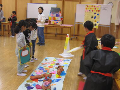 2年生が計画し時間をかけて準備して、1年生を招待しました。2年生が作ったゲームの遊び方の説明をし、1年生がグループごとにいろいろなゲームを楽しみました。素敵な景品もありました。祭りの最後には、2年生が作ったおみこしをみんなで担ぎました。
