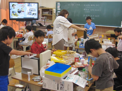 たくさんの材料から、箱の組み合わせ方や材料の使い方を工夫して作っています。