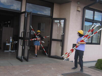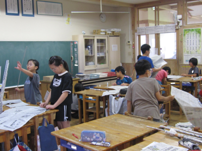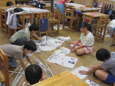 新聞紙を丸めて部品を作り、後日体育館で大きな作品を作ります。