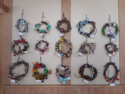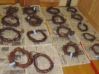 1年生が昨日サツマイモのつるで作ったリースが並んでいます。乾燥させて、後日飾りを付けるそうです。