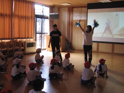ラジオ体操やダンスも上達し、ダンスに使うポンポンの説明を聞きました。