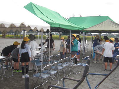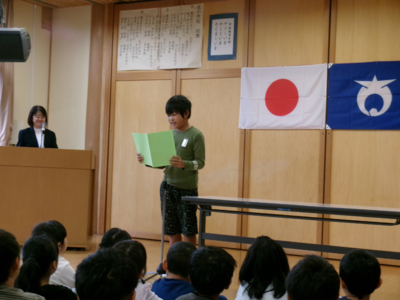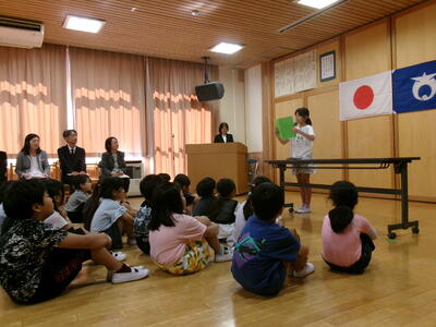 日頃お世話になっているスクールガードの皆さん、学校支援ボランティアさん、田んぼ体験学習で世話になった方をお招きしました。代表児童が感謝の言葉を述べ、全校生で作ったメッセージカードを渡しました。