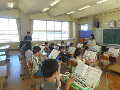 リズムを打ったり、鍵盤ハーモニカで演奏したりしました。