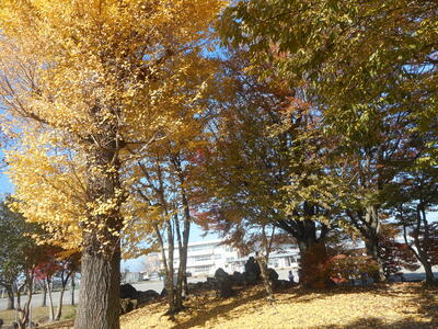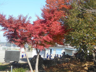 木々が赤や黄色に色づき、日の光をあびて鮮やかに美しく校庭を彩っています。