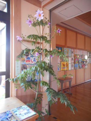 スクールガードさんが学校に皇帝ダリアを持ってきて、ホールに飾ってくだいました。