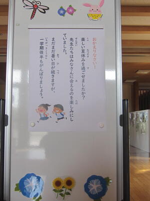 長かった夏休みが終了し、今日から学校がスタートしました。久しぶりに会った子供たちは身長もぐんと伸び、日焼けしてたくましく感じました。予報ではまだまだ暑さが続くようですが、よく寝て、よく食べて、暑さに負けずに元気に登校してほしいと思います。