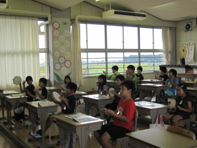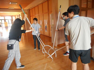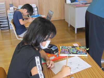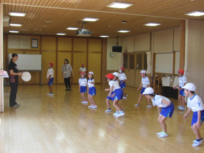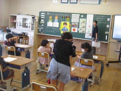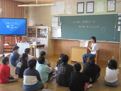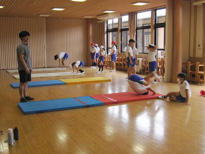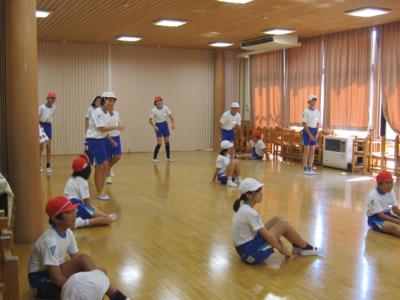 暑さ指数が高いため、体育はエアコンの効いた多目的室で表現を中心に実施しています。