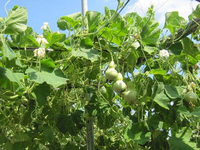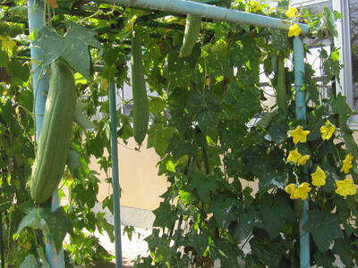 暑い日が続いていますが、4年生の「ひょうたん」や5年生の「ヘチマ」は元気に育ち、葉は青々と茂って実をつけています。