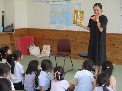 本日の昼休み(13:00~13:15)に、図書ボランティアの方による読み聞かせをイングリッシュルームで実施しました。対象を下学年(1~3年生)とし、夏休み前の実施に続いて、今年度2回目の取組でした。