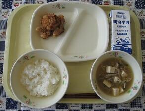 ごはん、牛乳、とりからあげのレモンソース和え、キムチスープ