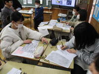 なかよしタイムでは、1~5年生の児童が手話を交えた歌の練習に励みました。曲は「ビリーブ」です。5年生が中心となって手話付きの動画を事前に撮影し、その動画を視聴しながらなかよし班ごとに集まって練習しました。歌は6年生を送る会で披露されます。