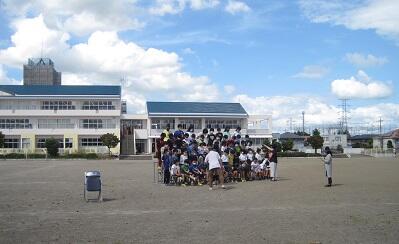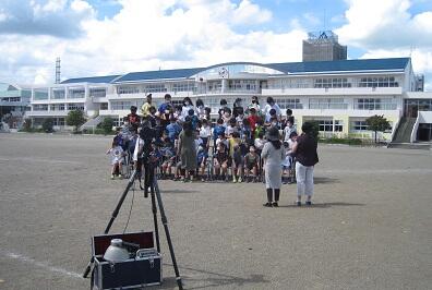 壁面がきれいに塗装された校舎をバックにして、学年全体