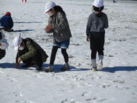休み時間には、校庭に積もりシャーベット状になった雪で遊ぶ子どもたちの姿が、あちらこちらで見られました。雪の冷たさで手を真っ赤にしながらも、うれしそうな表情で遊ぶ子どもたちは元気そのものです。まるで雪の冷たさを楽しんでいるかのようでした。