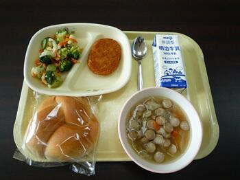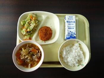 米粉パン ポテトコロッケ フレンチサラダ 野菜とウインナーのスープ