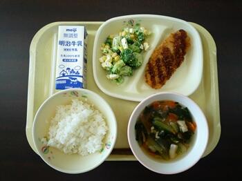 ごはん 白身魚フライ ブロッコリーとチーズのサラダ 生姜仕立てスープ