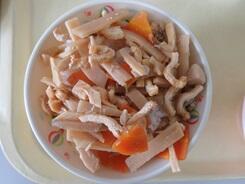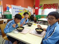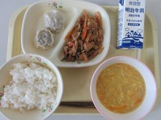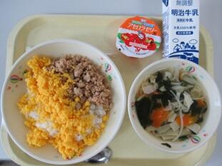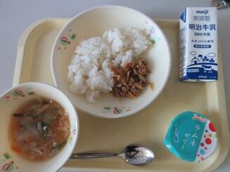 今日の給食は、和風ビビンバ丼(ご飯、和風ビビンバ丼の具)、牛乳、ワンタンスープ、ラムネゼリーです。高根沢町で生産されたものは、にんじん、玉ねぎ、米です。今日もたいへんおいしく頂きました。
