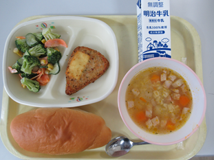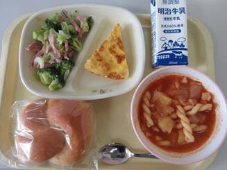 今日の給食は、ミートソースペンネ、牛乳、イタリアンサラダ、牛乳パン、ヨーグルトです。高根沢町で生産されたものは、にんじん、キャベツ、玉ねぎです。今日もたいへんおいしく頂きました。