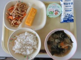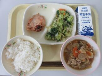 今日の給食は、ご飯、牛乳、チキン味噌カツ、干ぴょうのごま酢和え、豆腐とわかめの味噌汁です。高根沢町で生産されたものは、味噌、豆腐、にんじん、キャベツ、ねぎ、米です。今日もたいへんおいしく頂きました。