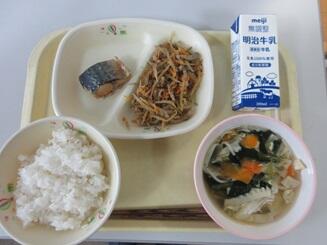 今日の給食は、ご飯、牛乳、鶏肉味噌焼き、じゃこのサラダ、根菜のごま汁です。味噌、にんじん、キャベツ、ねぎ、米です。今日もたいへんおいしく頂きました。