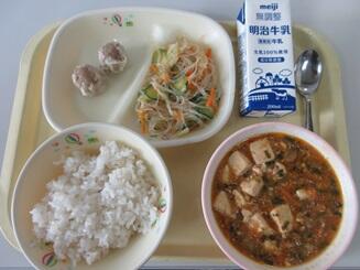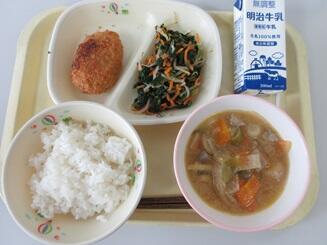 今日の給食は、ご飯、牛乳、ひじきの炒り煮、鶏だんご汁です。高根沢町で生産されものは、大豆、にんじん、ねぎ、米です。今日もたいへんおいしく頂きました。