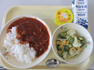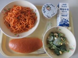今日の給食は、はちみつパン、牛乳、スパゲッティナポリタン、ブロッコリーとチーズのサラダ、ヨーグルトです。高根沢町で生産されたものは、にんじん、玉ねぎ、きゅうりです。今日もたいへんおいしく頂きました。