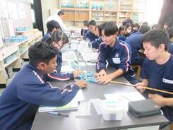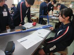 物質のもつエネルギーと、速さや質量の関係を調べる実験に取り組んでいました。