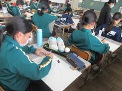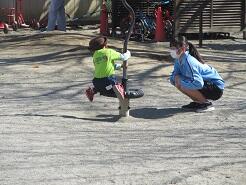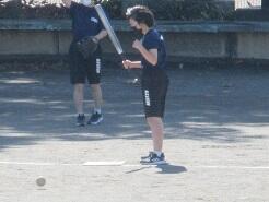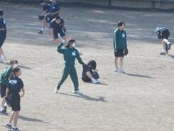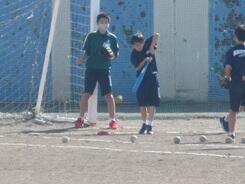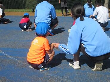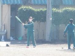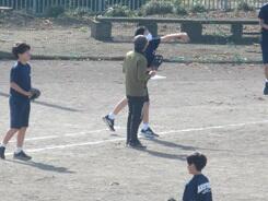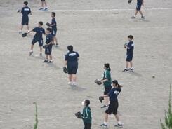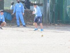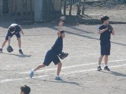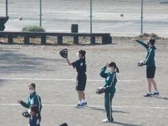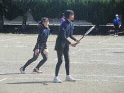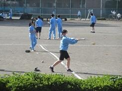 室内でソフトボールのルールの学習をしてから、校庭で実技に取り組んでいました。