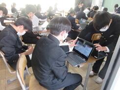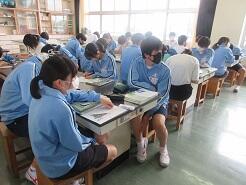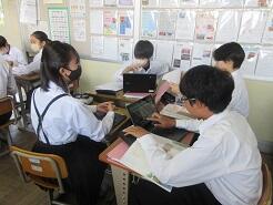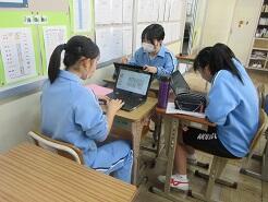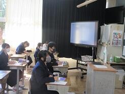 伊曽保物語の「犬と肉のこと」か「鳩と蟻のこと」のどちらかの話を、スライドにまとめて発表する授業が進められていました。