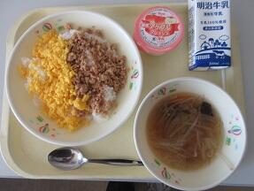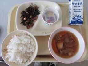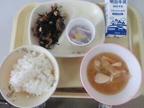 今日の給食は、セルフ舞茸入り五目ご飯(ご飯・舞茸入り五目ご飯の具)、牛乳、厚焼き卵、さつま芋汁です。高根沢町で生産されたものは、ねぎ、舞茸、さつまいも、米です。今日もたいへんおいしく頂きました。
