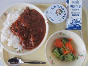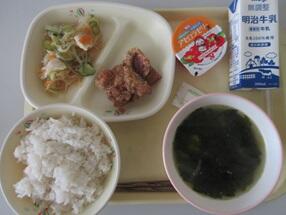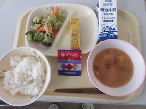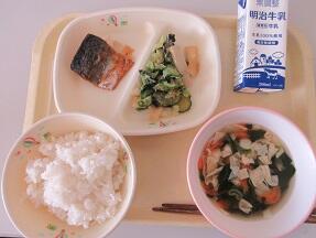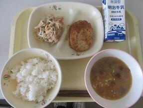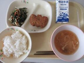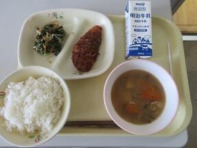 今日の給食は、ご飯、牛乳、かぼちゃハンバーグ、ほうれん草のごま和え、大根と油揚げの味噌汁です。高根沢町で生産されたものは、味噌、ねぎ、玉ねぎ、米です。今日もたいへんおいしく頂きました。