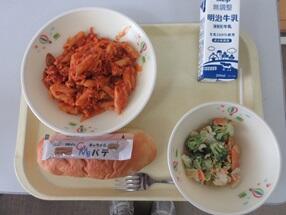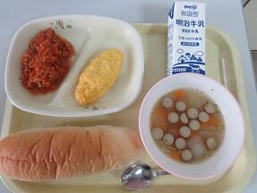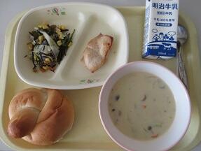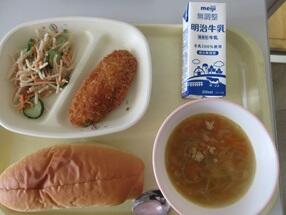 今日の給食は、セルフコロッケバーガー(丸型牛乳パン・豚肉コロッケ)、牛乳、きゅうりと枝豆のサラダ、ポトフです。高根沢町で生産されたものは、玉ねぎです。今日もたいへんおいしく頂きました。