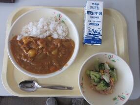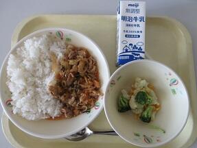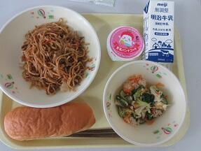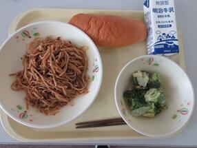 焼きそば、牛乳、ブロッコリーとチーズのサラダ、牛乳パンです。高根沢町で生産されたものは、にんじん、キャベツです。今日もたいへんおいしく頂きました。