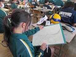 自画像を描く単元で、自分らしい表情・ポーズ・背景を考えてスケッチしていました。
