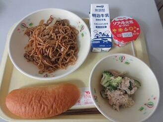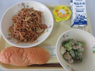 今日の給食は、焼きそば、牛乳、チキンサラダ、牛乳パン、ヨーグルトです。高根沢町で生産されたものは、きゅうり、キャベツです。今日もたいへんおいしく頂きました。