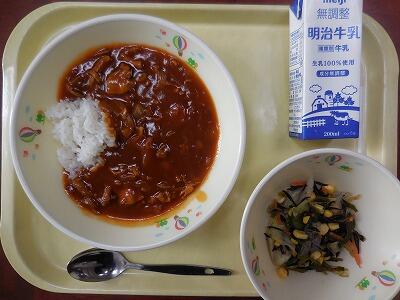 【給食メニュー】トマトたっぷりハヤシライス、牛乳、こんにゃく海藻サラダです。トマトの甘みが口の中でとろけるハヤシライスがとても美味しく、食が進みました。ごちそうさまでした。