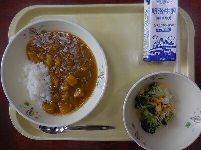【給食メニュー】チキンカレーライス、コーンサラダ、牛乳です。生徒にとって好物の一つ