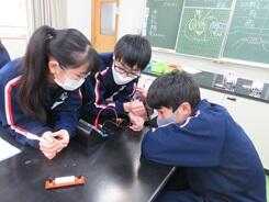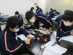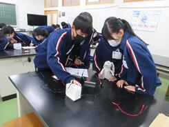 電流と電圧の関係を調べる実験に、グループごとに取り組んでいました。