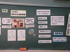 今日は、2年1、4、5組が、栄養教諭とのTTの授業を実施しました。「地域の食材のよさを考えよう。」ということで、伝統料理、郷土料理や、和食のよさについて学習していました。どのクラスも、栄養教諭さんと教科担任が連携し、とても活気のある授業になっていました。